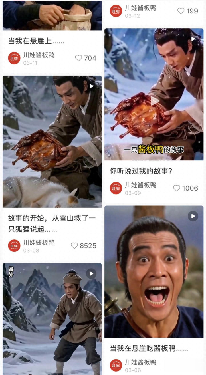 这个反转让全网笑疯,网友们纷纷围绕剧情开始二创,将前来“复仇”的人物改成豆汁、烤鸡甚至雪山等各种版本。原创作团队也在自己的社交媒体账号上开始连载,“酱板鸭宇宙”不断扩大,还做出了花絮与番外。各路官方账号也在接力玩梗,用AI创作出反诈、文旅推介等各种反转。