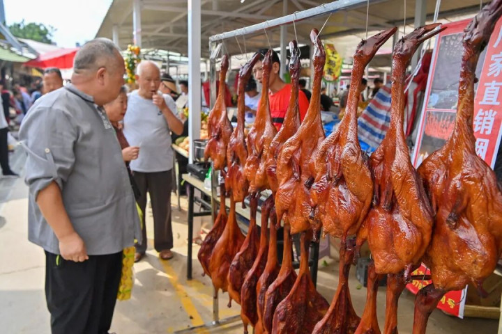 贵阳,市民们在市集选购酱板鸭。(图/视觉中国)